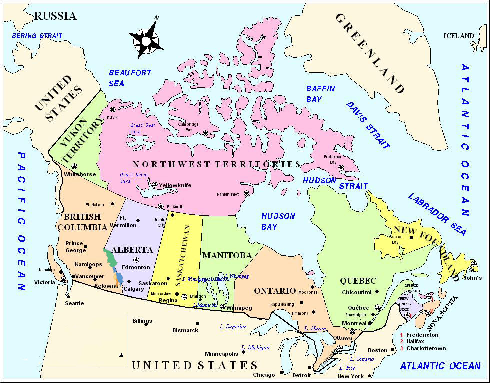 Canada consists of ten provinces and three territories, in the northern part of the continent of North America. It extends from the Atlantic to the Pacific and northward into the Arctic Ocean, covering 9.98 million square kilometres (3.85 million square miles) in total, making it the world's second-largest country by total area and the fourth-largest country by land area. Canada's common border with the United States forms the world's longest land border.